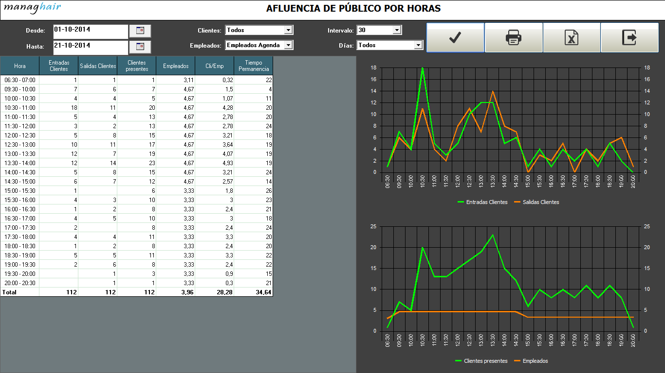 Desde la hora de apertura hasta la hora de cierre te muestra el número de clientes que entran y salen del salón, el tiempo medio de permanencia de los clientes en el salón y el número de empleados.